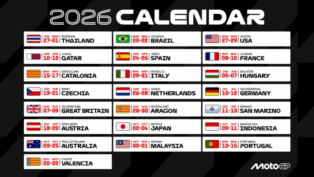 ฤดูกาล โมโตจีพี 2026 เตรียมระเบิดศึกความเร็วระดับโลกอีกครั้ง! แฟนความเร็วจะได้ชมการแข่งขันตลอดทั้งปี ครบทุกทวีป ทั้งยุโรป เอเชีย อเมริกา และตะวันออกกลาง โดยมีรายการกว่า 20 สนามทั่วโลก รวมถึง ThailandGP 2026 ที่สนามช้าง อินเตอร์เนชั่นแนล เซอร์กิต จังหวัดบุรีรัมย์ ซึ่งยังคงเป็นหนึ่งในไฮไลต์ของแฟนชาวไทย