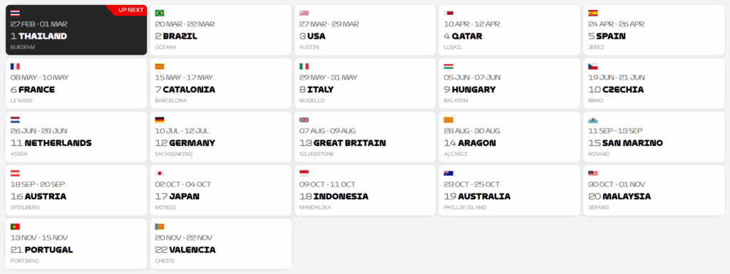 ฤดูกาล โมโตจีพี 2026 เตรียมระเบิดศึกความเร็วระดับโลกอีกครั้ง! แฟนความเร็วจะได้ชมการแข่งขันตลอดทั้งปี ครบทุกทวีป ทั้งยุโรป เอเชีย อเมริกา และตะวันออกกลาง โดยมีรายการกว่า 20 สนามทั่วโลก รวมถึง ThailandGP 2026 ที่สนามช้าง อินเตอร์เนชั่นแนล เซอร์กิต จังหวัดบุรีรัมย์ ซึ่งยังคงเป็นหนึ่งในไฮไลต์ของแฟนชาวไทย